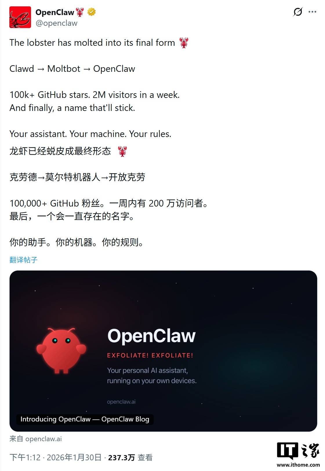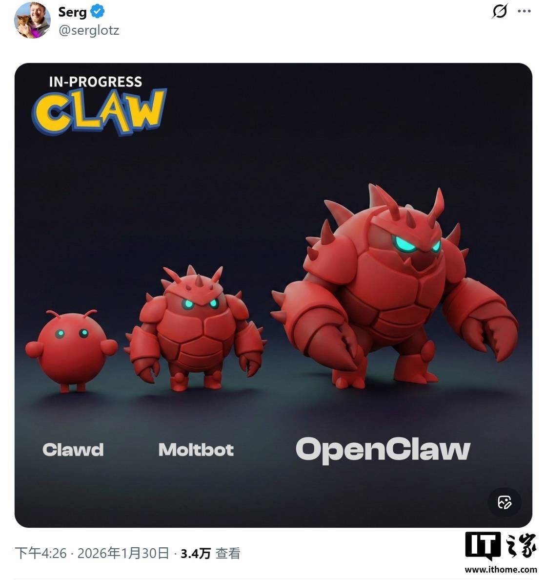 IT之家 1 月 31 日消息,爆火开源 AI 智能体 Clawdbot 在数小时内经历了两次更名,在短暂更名为 Moltbot 后,迅速调整为听起来更为顺口的 OpenClaw。