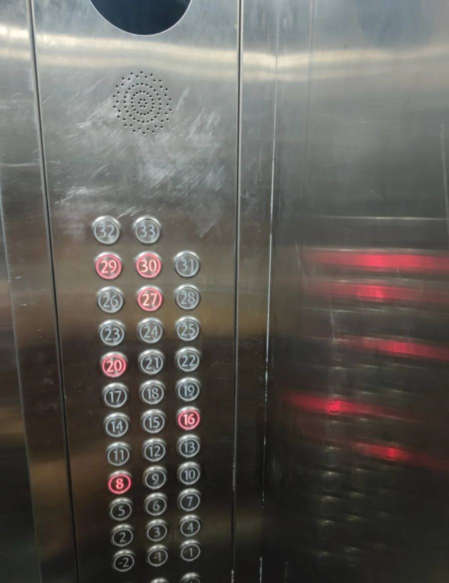 我们这栋楼两梯四户,总高31层。等电梯是什么体验?这么说吧,早高峰我按下电梯,然后回家刷牙洗脸,再出来,电梯还没到!有一次坏了一部电梯,那简直是灾难。当然,顶楼也有个好处,就是电梯从上往下接人,你永远不用担心超重被甩下,算是这点苦难里唯一的甜吧。